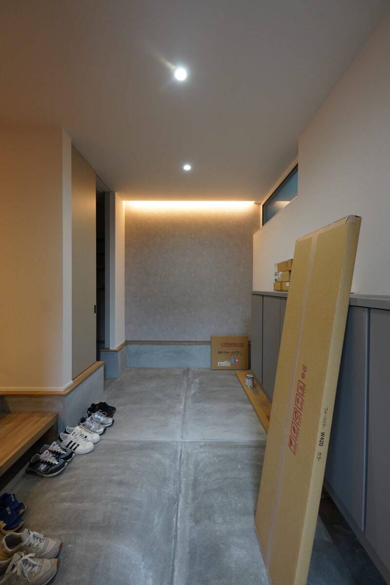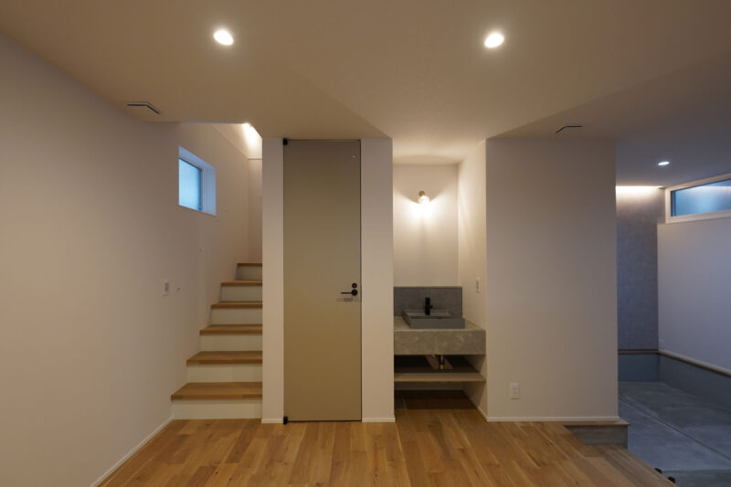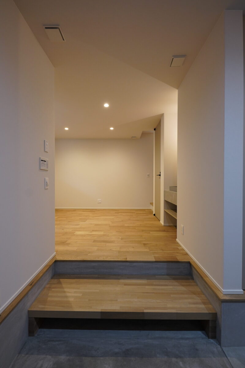 玄関アプローチをスロープにしているので土間内にステップを1段設けています。