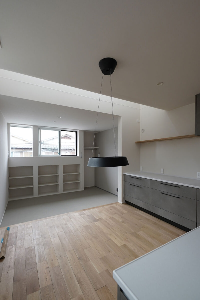 玄関入ってすぐに8帖のフリースペースを配置。ピアノを置いたり、お子様がお友達と遊ぶスペース、また奥さまがお花をされているのでワークショップの場としても活用できます。