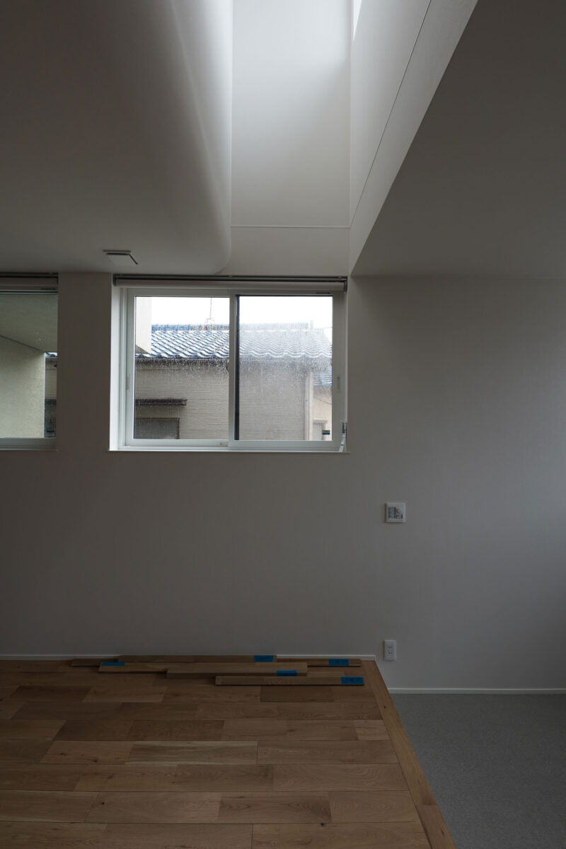 南と東に大きな窓を設け、LDKの中心に位置するダイニング上部には細長い吹き抜けを配置。