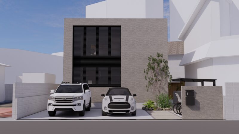 裏にあるご実家の位置や道路側に駐車スペースを持ってくることなど気をつけながら配置計画し、南東向きの2階建てパッシブデザインをご提案させていただきました。