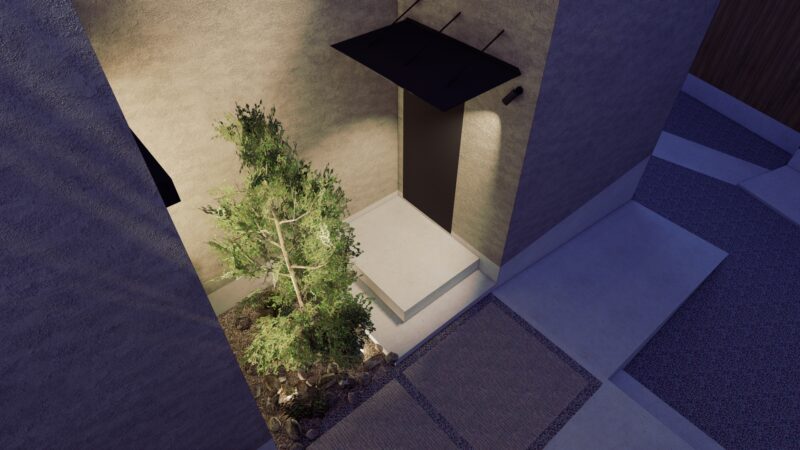 道路側からの視線を直接受けないよう、玄関はあえて正面に配置せず、建物の奥へと導く計画としました。