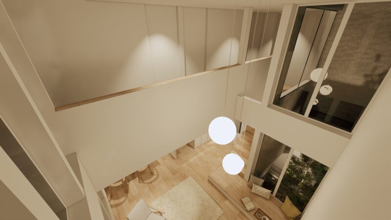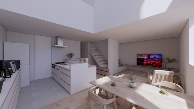 ダイニング上部には吹き抜けを設け、高窓からやわらかな光を取り込みます。