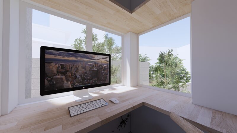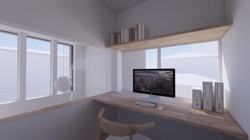 吹き抜けに面した2階の書斎には、外の景色を切り取る窓と、LDKの気配をやわらかく伝える強化ガラスをはめ込みました。