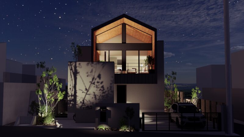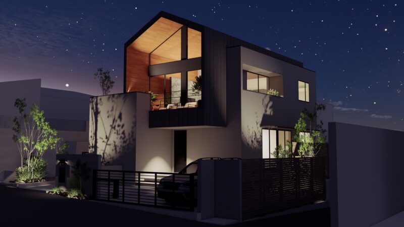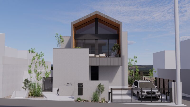 南西向きの2階建てパッシブデザインハウス。