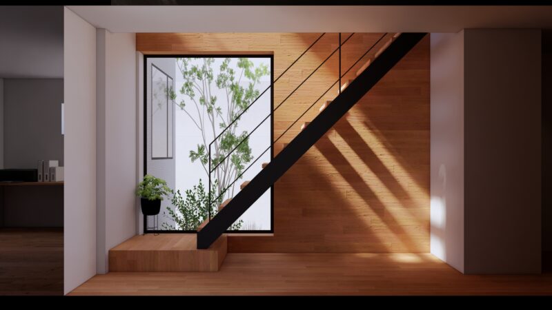 1階に入ると、まず迎えてくれるのが坪庭の緑を切り取る大きな窓と階段。