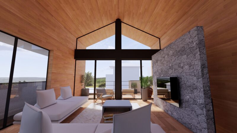 2階に上がると三角屋根の形状を活かした勾配天井と大開口が印象的なリビングが広がります。
