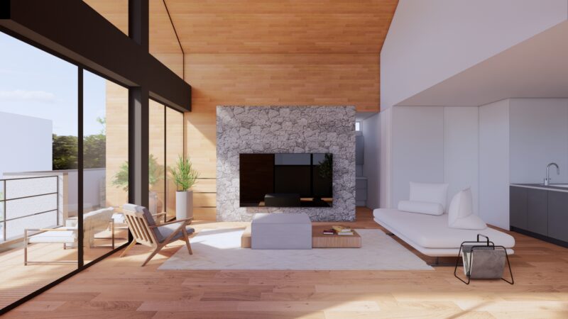 天井から壁へと連続する木の面。視線はそのまま、バルコニーへと抜けていきます。