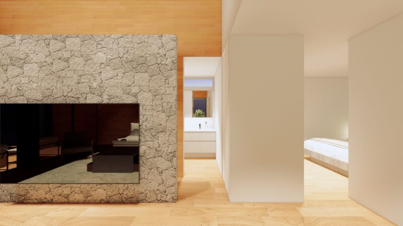 素材感の強い石をあえてぶつけることで、空間に「重心」をつくっています。