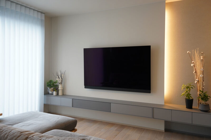 テレビボードはミラタップさんのピッタラを採用し、背面壁に埋め込まれたように施工しています。