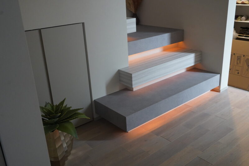 浮遊感のある段板の下には間接照明を仕込み、やさしい光が足元を照らしてくれる仕様。夜は照明の効果でホテルライクな雰囲気が漂い、昼間とはまた違った表情を楽しむことができます。