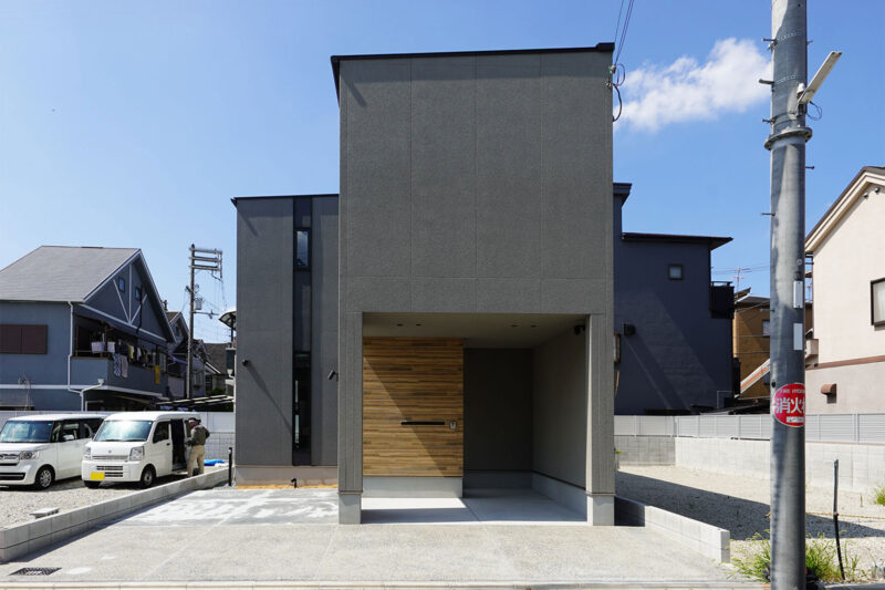 グレーを基調とした外壁に、木目をアクセントとして取り入れた落ち着いた佇まいです。