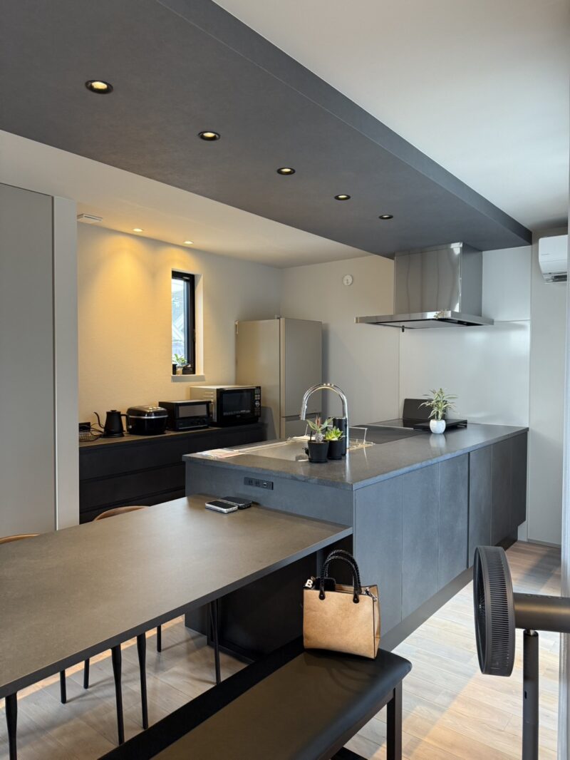 アイランド型のキッチンにはダイニングテーブルを直結させ、料理・食事・片付けの動線を最短に。