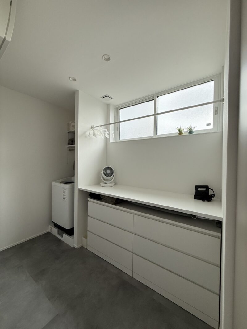 壁際には大きなカウンターと収納を設け、洗濯物を畳む・アイロンをかける・一時的に置くといった作業がスムーズにできます。