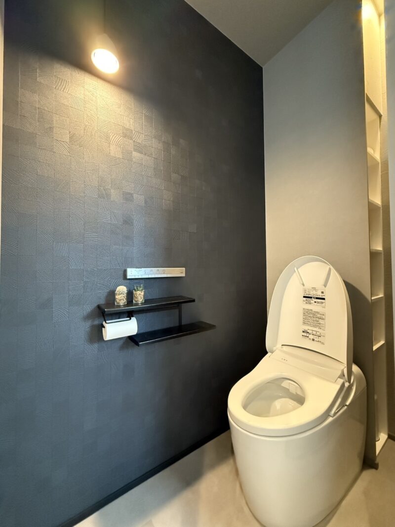 濃いめのアクセントクロスを取り入れることで、落ち着いた雰囲気と高級感を演出しました。