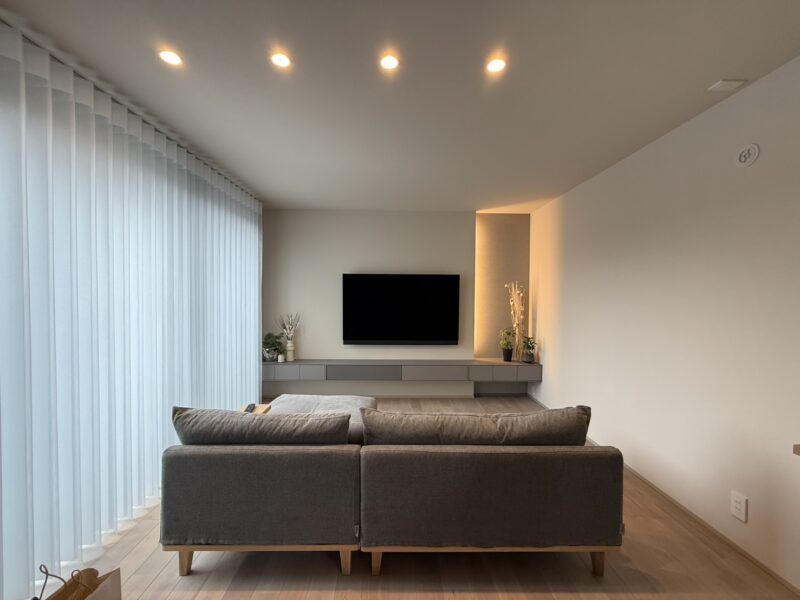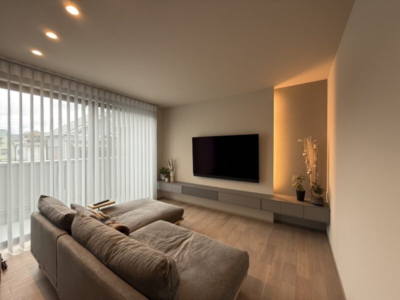 リビングはシンプルなデザインの中に、オーナー様のセンスが光る落ち着いた空間。