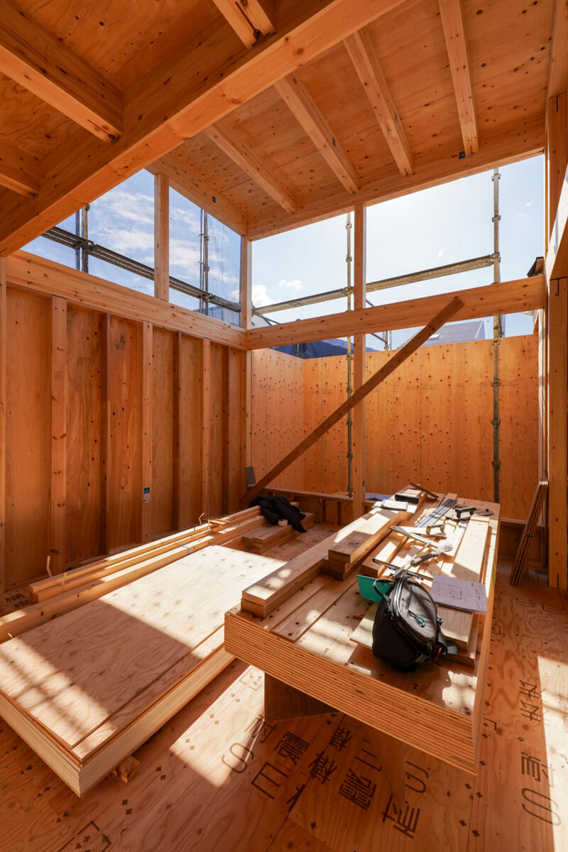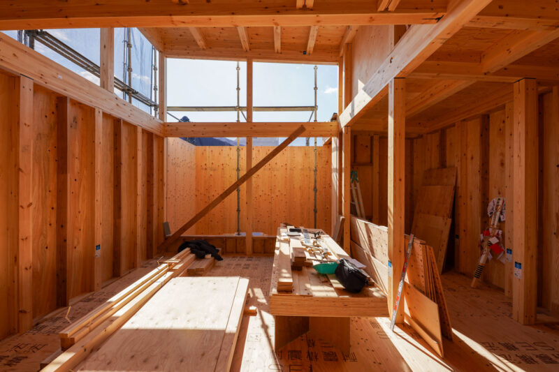 建て方当日に組まれた梁や柱が、この伸びやかな空間をしっかりと支えます。