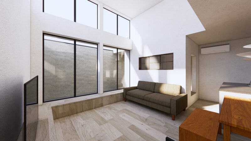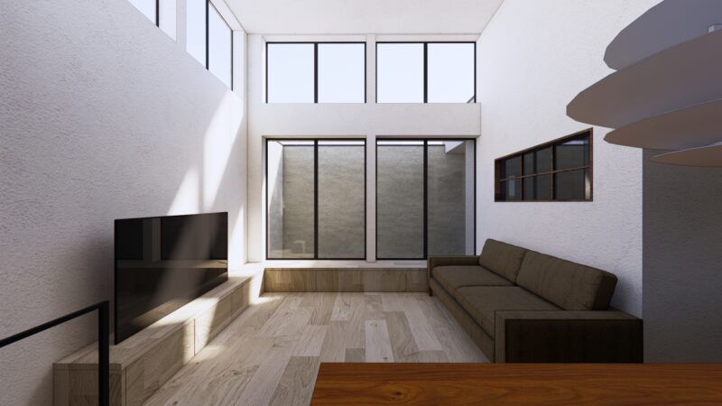 特にこの住まいの特徴でもある、吹き抜けと大きな開口。まだ仕上げ前の状態でも、上下に抜ける空間の広がりや、光が入ってくるイメージが十分に伝わってきます。