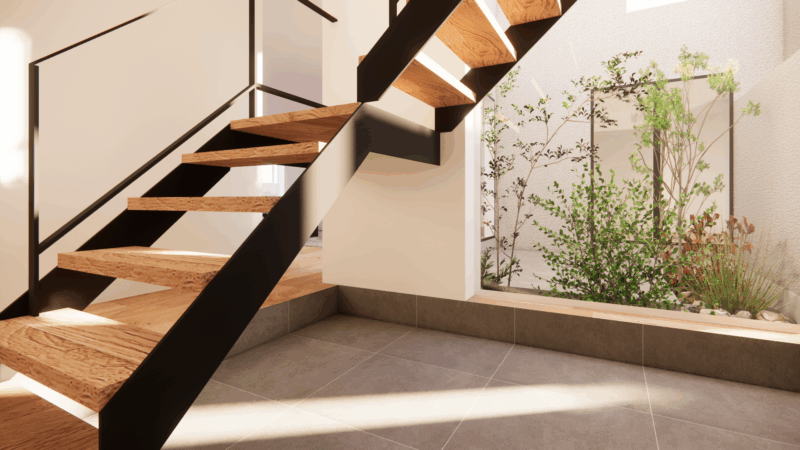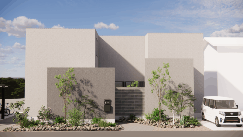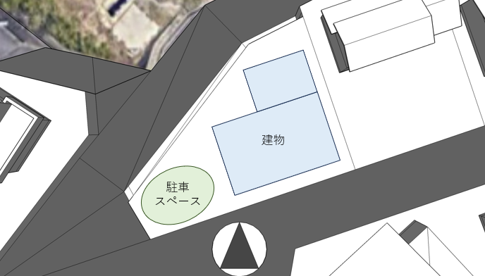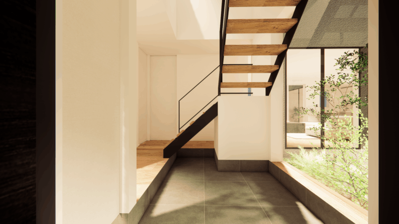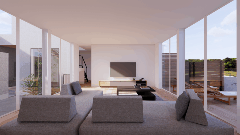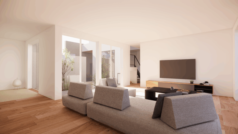 一方で、敷地は三角形に近い不整形な輪郭をしており、一般的な整形地とは異なる制約も伴います。そのため、建物配置や開口計画に工夫を凝らし、敷地形状を活かしながら光と抜けを最大限に取り込むプランをご提案させていただきました。
