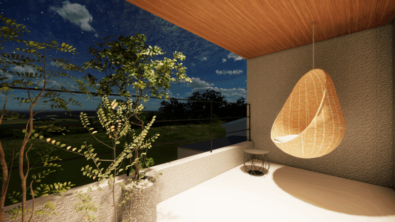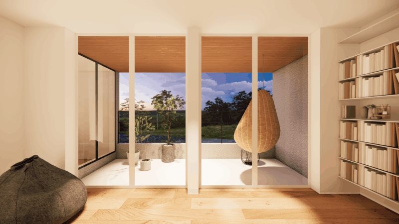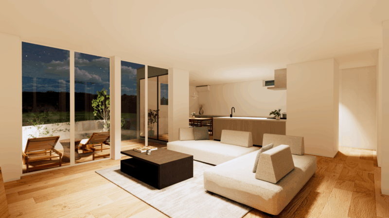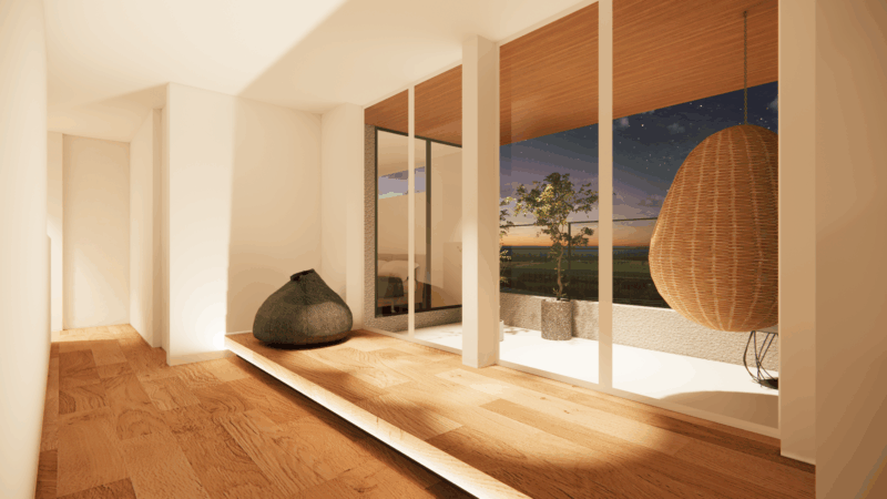 大きな開口からは空や遠景を取り込み、時間の移ろいを感じながらゆったりと過ごせる場所に。