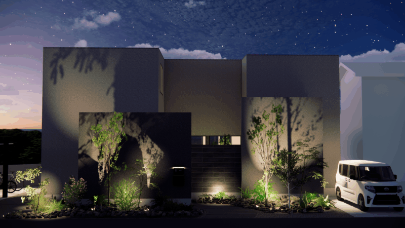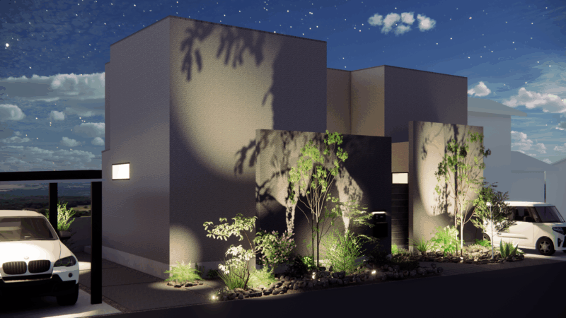 夜は植栽の影が壁面に映り込み、静かで奥行きのある表情をつくり出します。