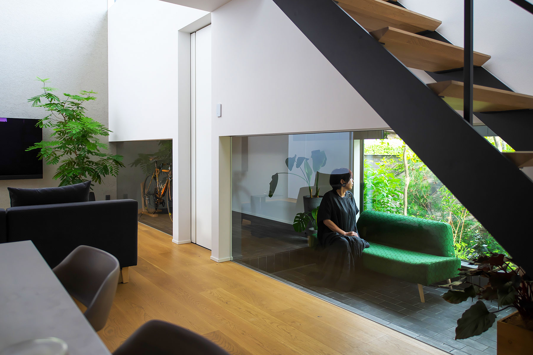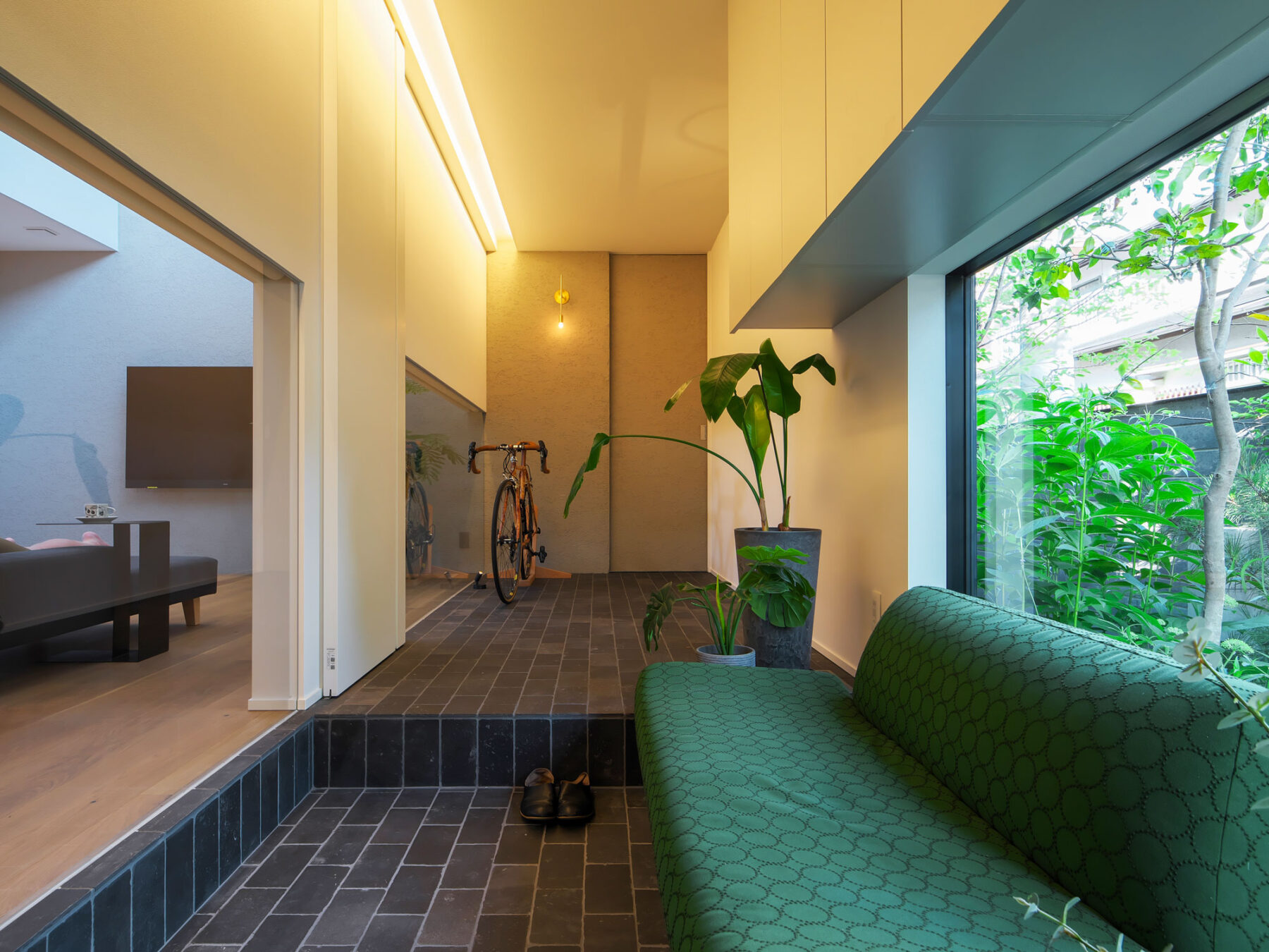 玄関に入ると、視線は中庭の緑を切り取る窓とソファへ。さらに、ご主人こだわりのためのギャラリースペースや土間収納、裏のご実家との直結動線も備え、趣味と暮らしの動線が心地よく交わる空間構成が特徴です。