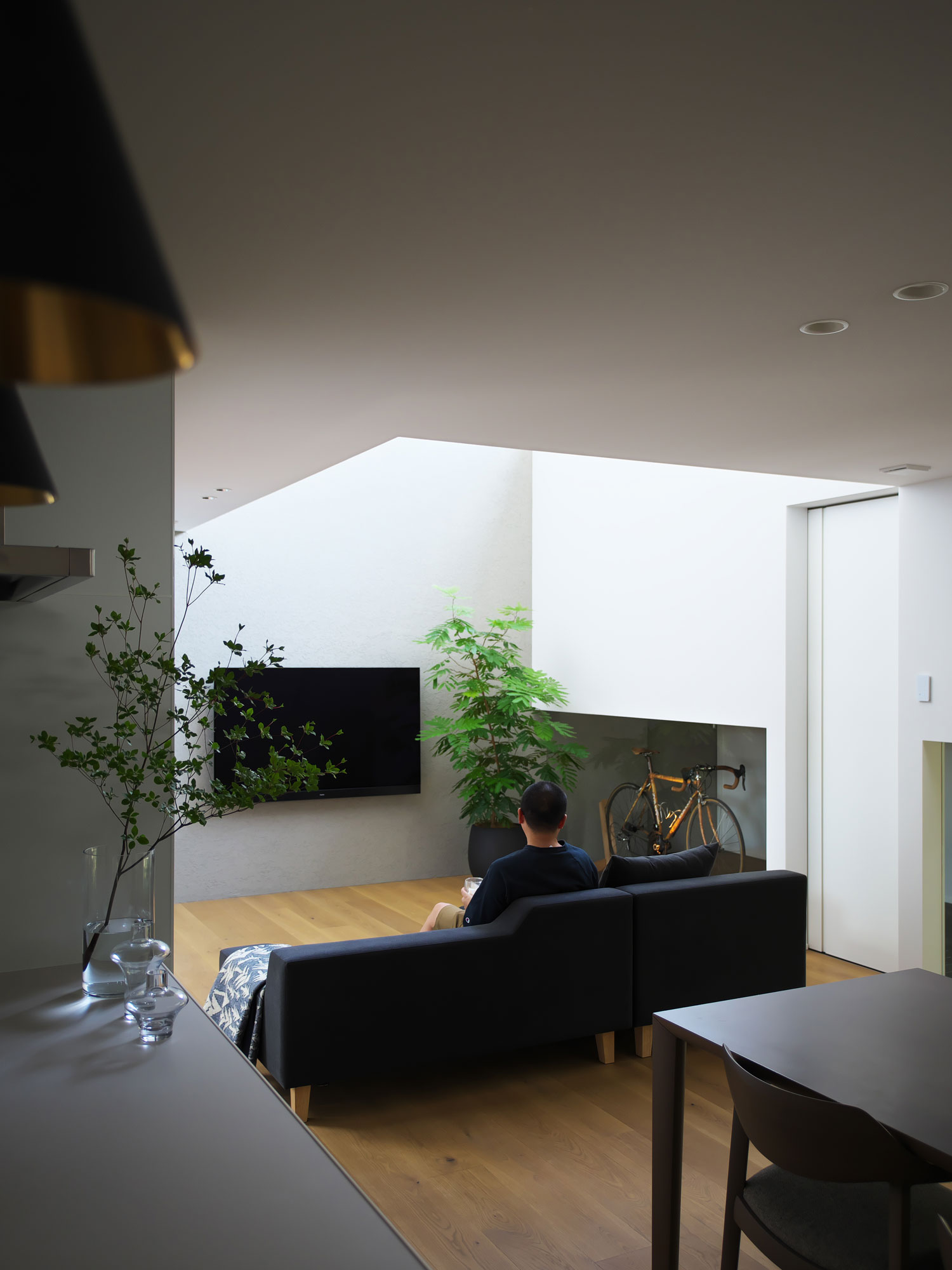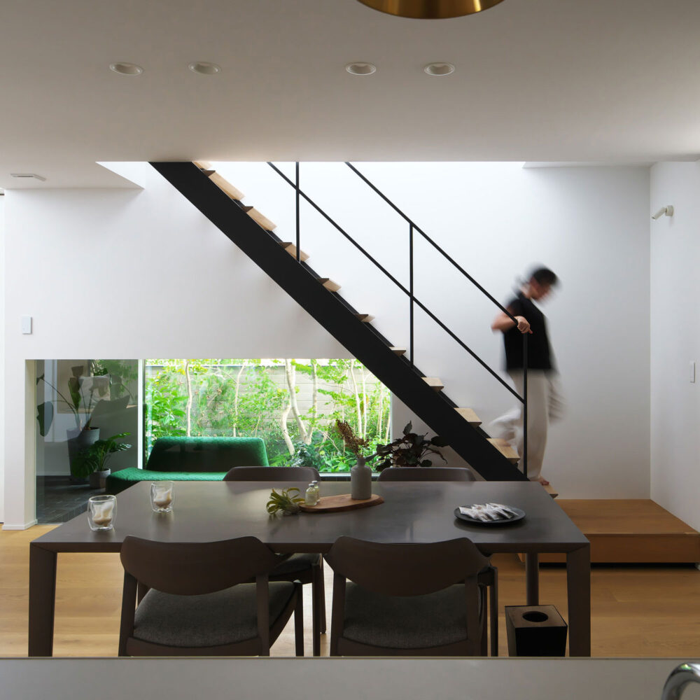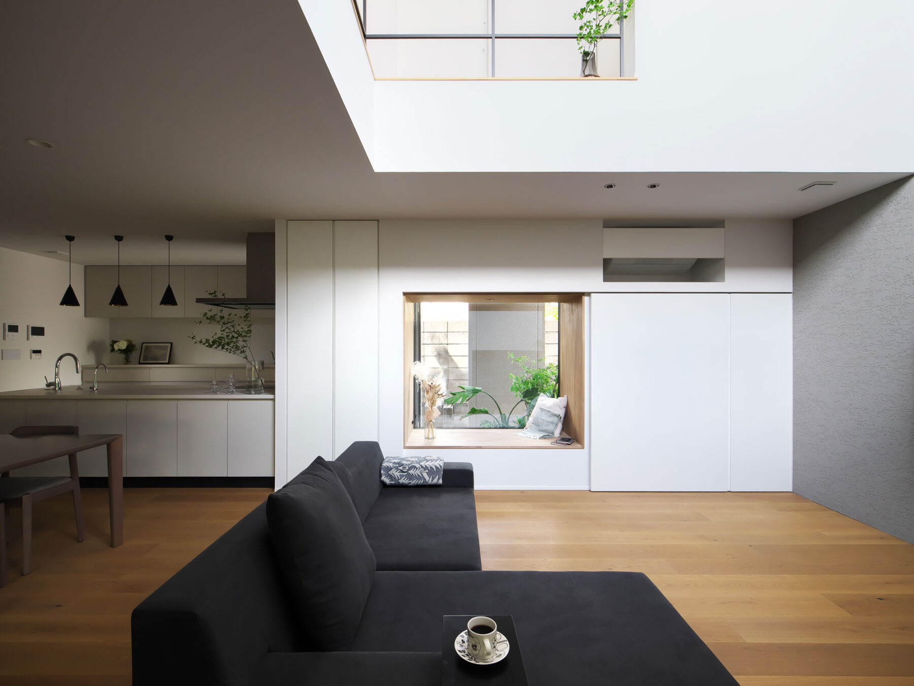 リビングは、天井高のある吹き抜けによって縦方向の開放感を確保。大きな開口部や高窓から自然光が降り注ぎ、時間帯によって光の表情が変化します。北側にはウィンドウベンチを設け、外の植栽を眺めながらくつろげる“セミアウトドア的居場所”を演出。壁面収納の中にはピアノが収まるスペースもあり、暮らしの機能とデザインが美しく調和しています。
