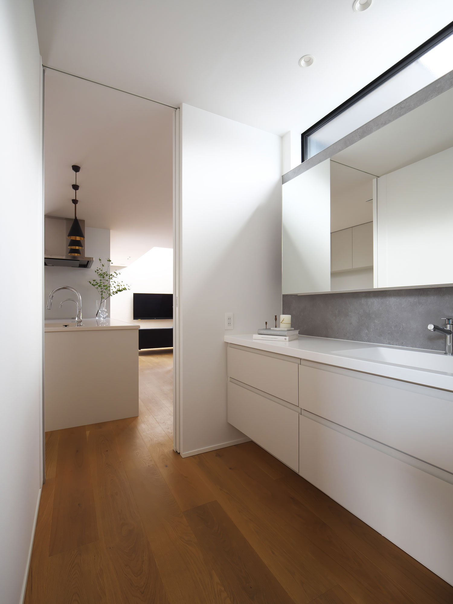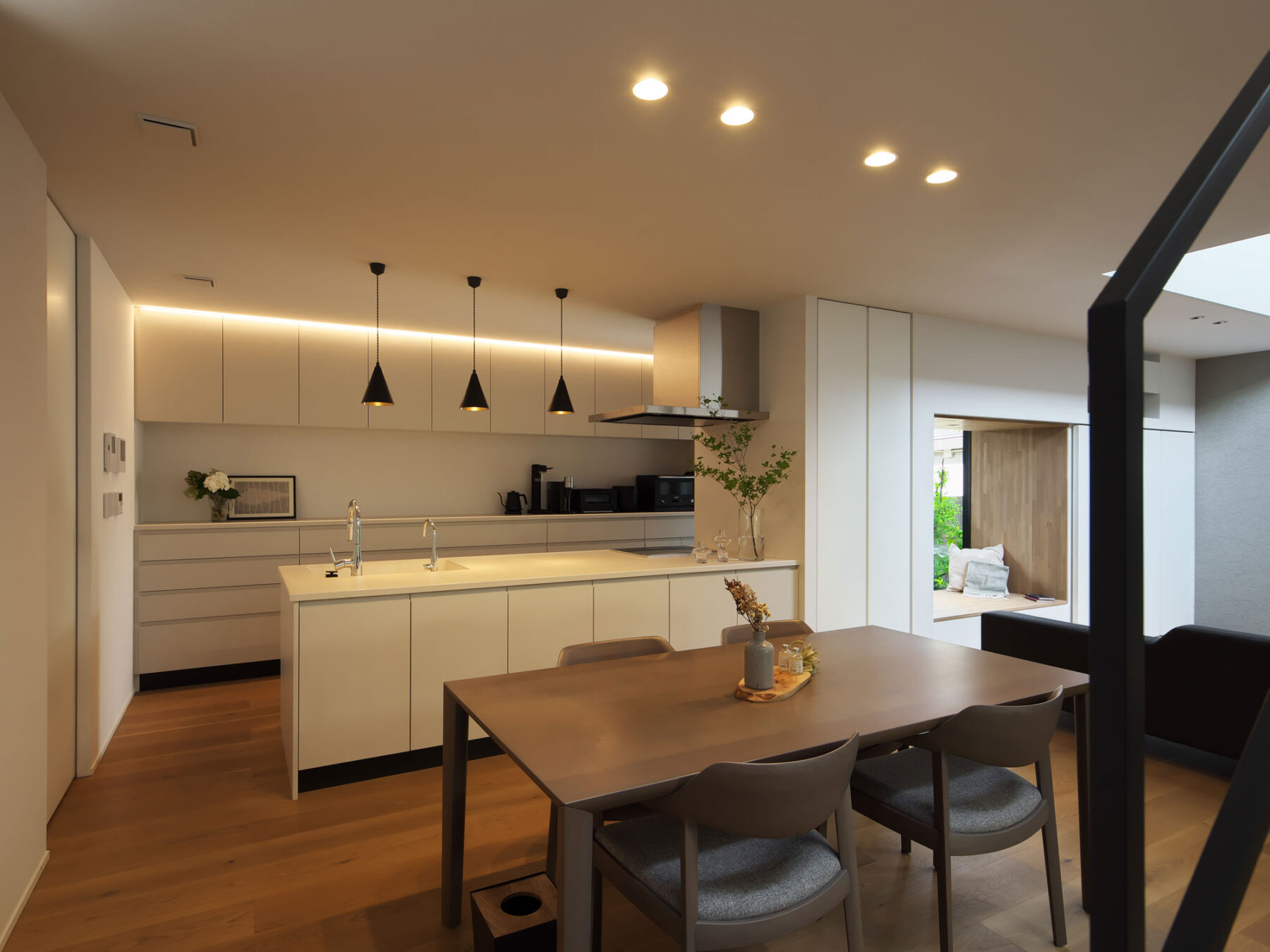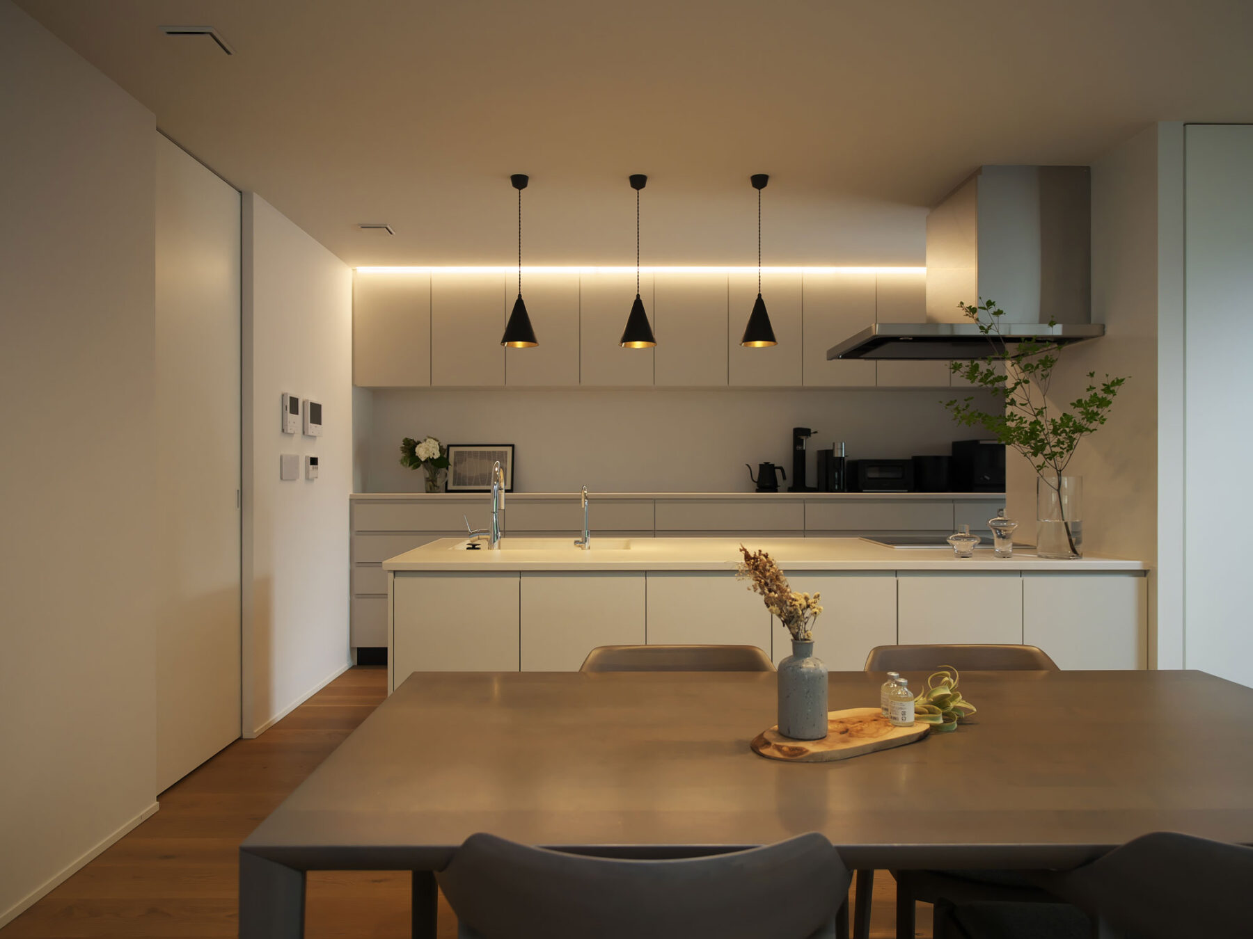 - 柔らかな光と直線美が映える、ミニマルなキッチン。