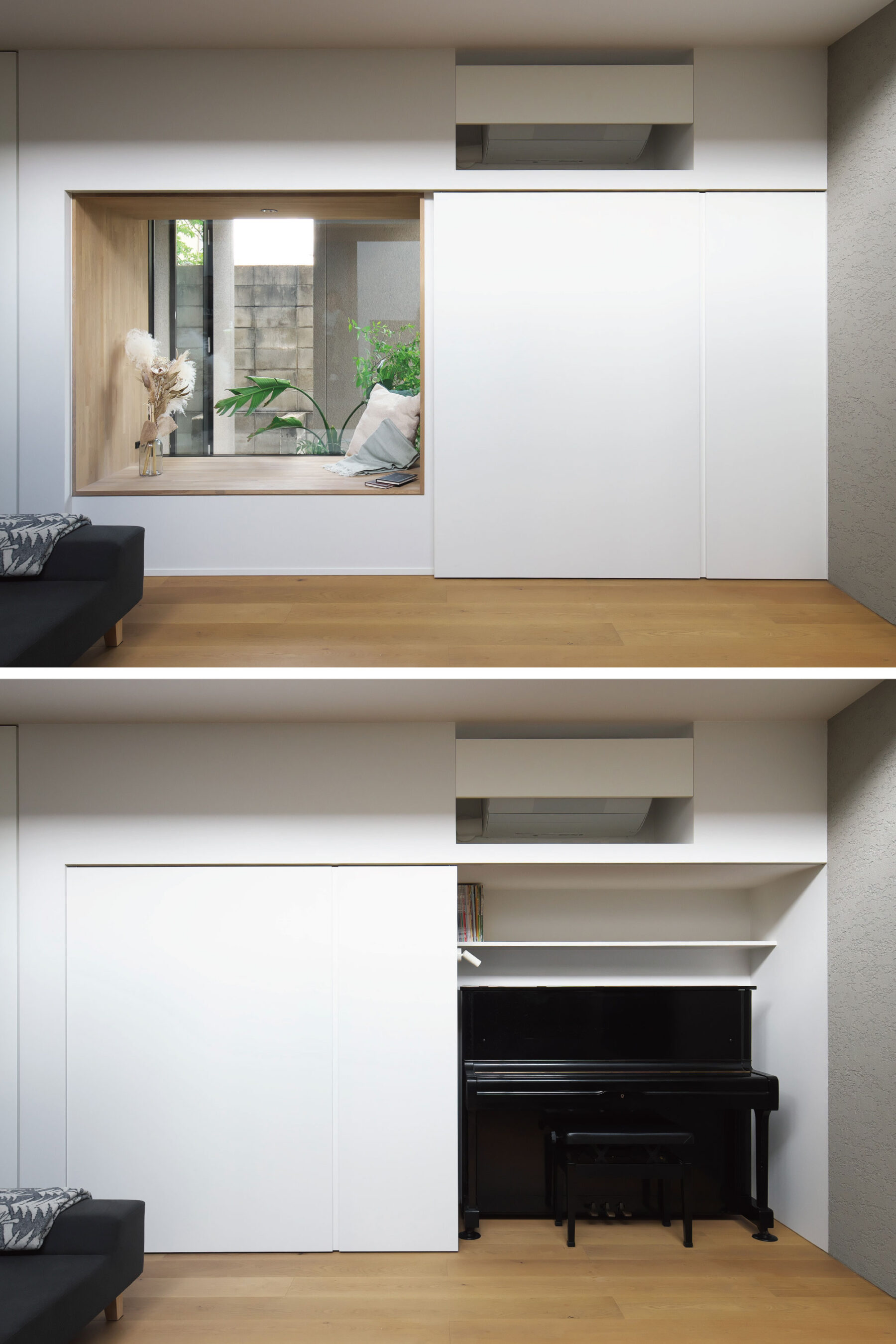 - 陽の光をたっぷり取り込むお家でもピアノを良い状態で保存できるよう、専用の収納スペースを設けました。