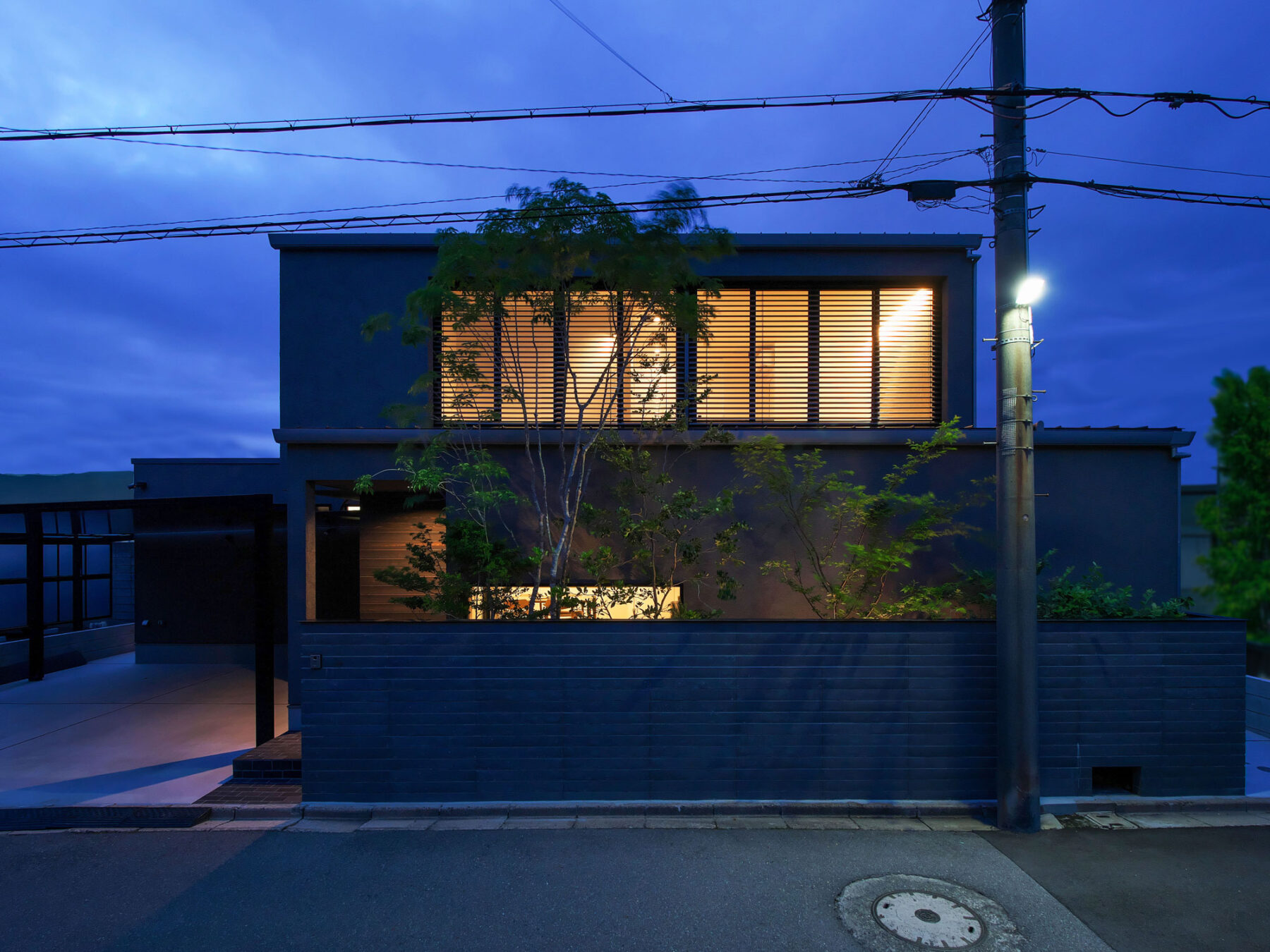 外観は、どっしりと水平ラインを意識したデザイン。通りに面した塀の隙間からは、中庭の植栽がそっと顔を覗かせ、街との関係性にほどよい距離感を生むデザインとなっています。