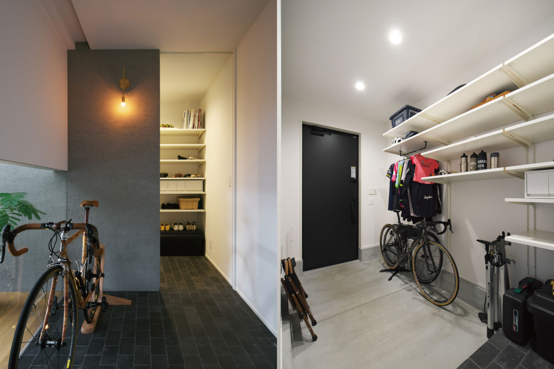 - ホールの奥にはロードバイク部屋。第二の玄関からスロープで外へスムーズに出られます。