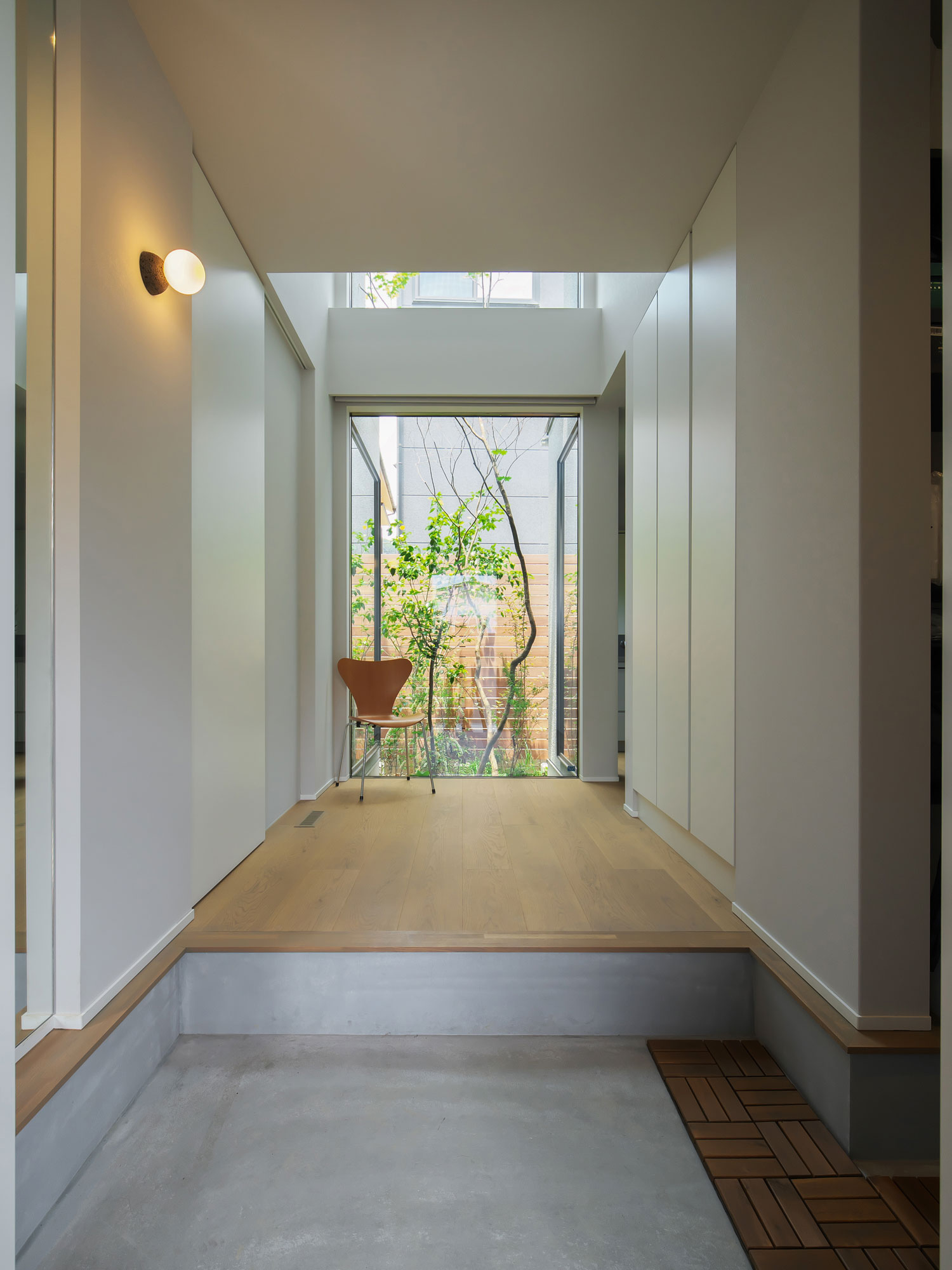 • 天井高を生かした開放的な玄関ホールは、正面に設けた大きな開口部から庭の緑を取り込みます。