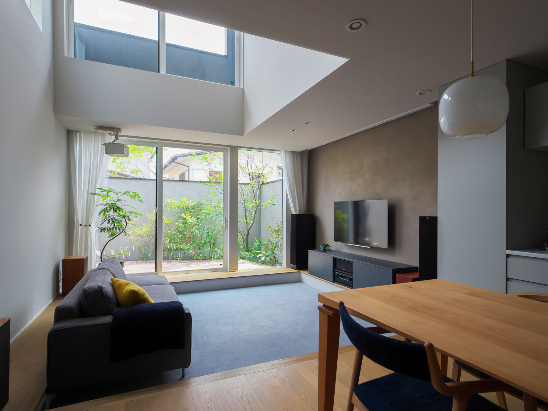 LDKは明るい色味を基調としたシンプルなインテリアで統一。1段下げたリビングはカーペット敷きとし、ダイニングとは素材とレベル差で緩やかにゾーニングしています。囲われた中庭に面することで外部とほどよくつながりながら、落ち着いたくつろぎの場となっています。