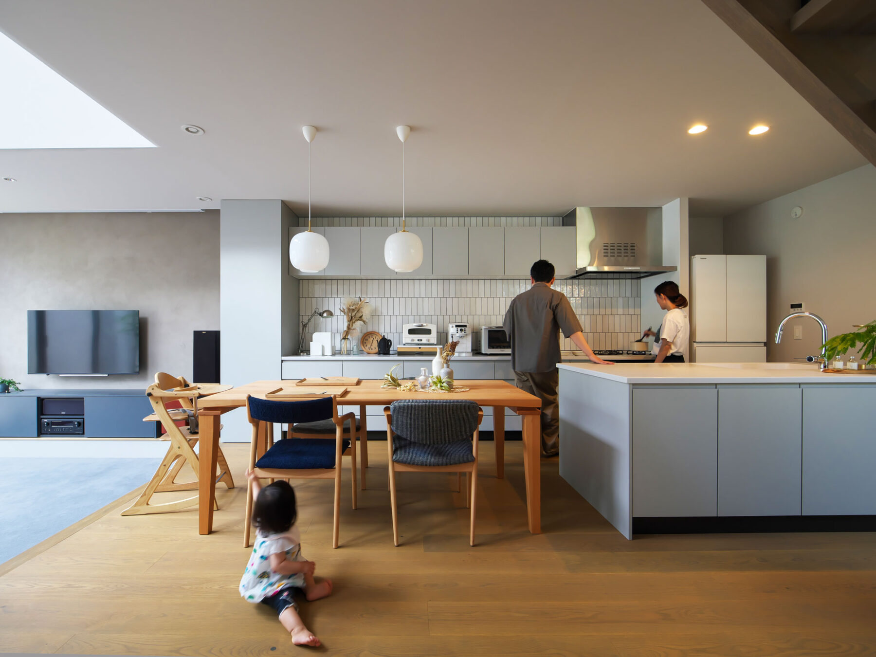 ダイニングとキッチンは直線的なレイアウトの中に適度な“隙間”を設け、行き止まりのない動線を確保。配膳や片付けがスムーズに行えるだけでなく、家族が自然に行き交う心地よい距離感が生まれています。