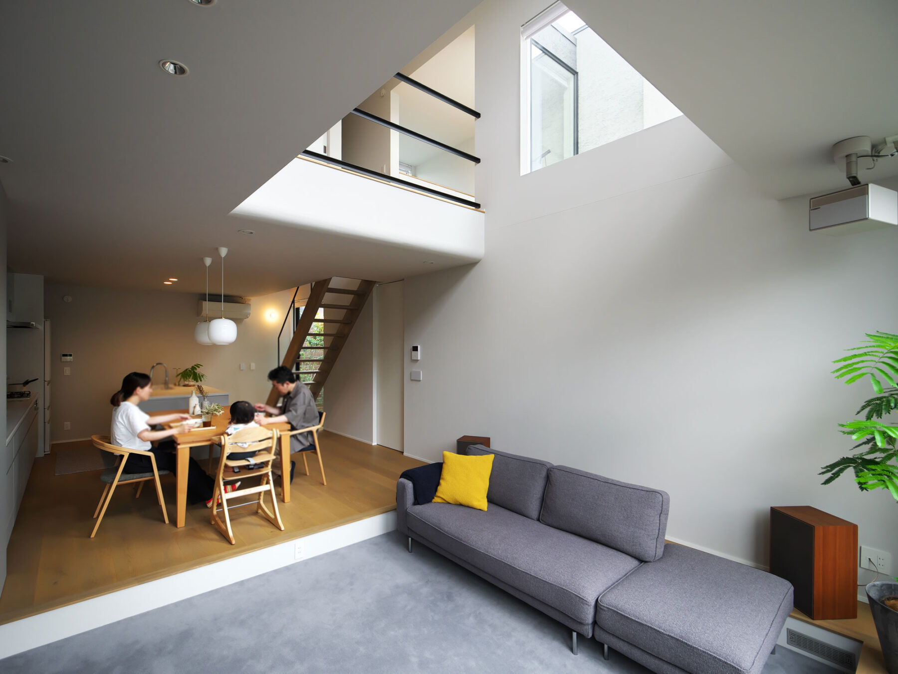 • 1段下がったリビングは大開口と吹き抜けによって、やわらかな光に満たされる明るい空間に。