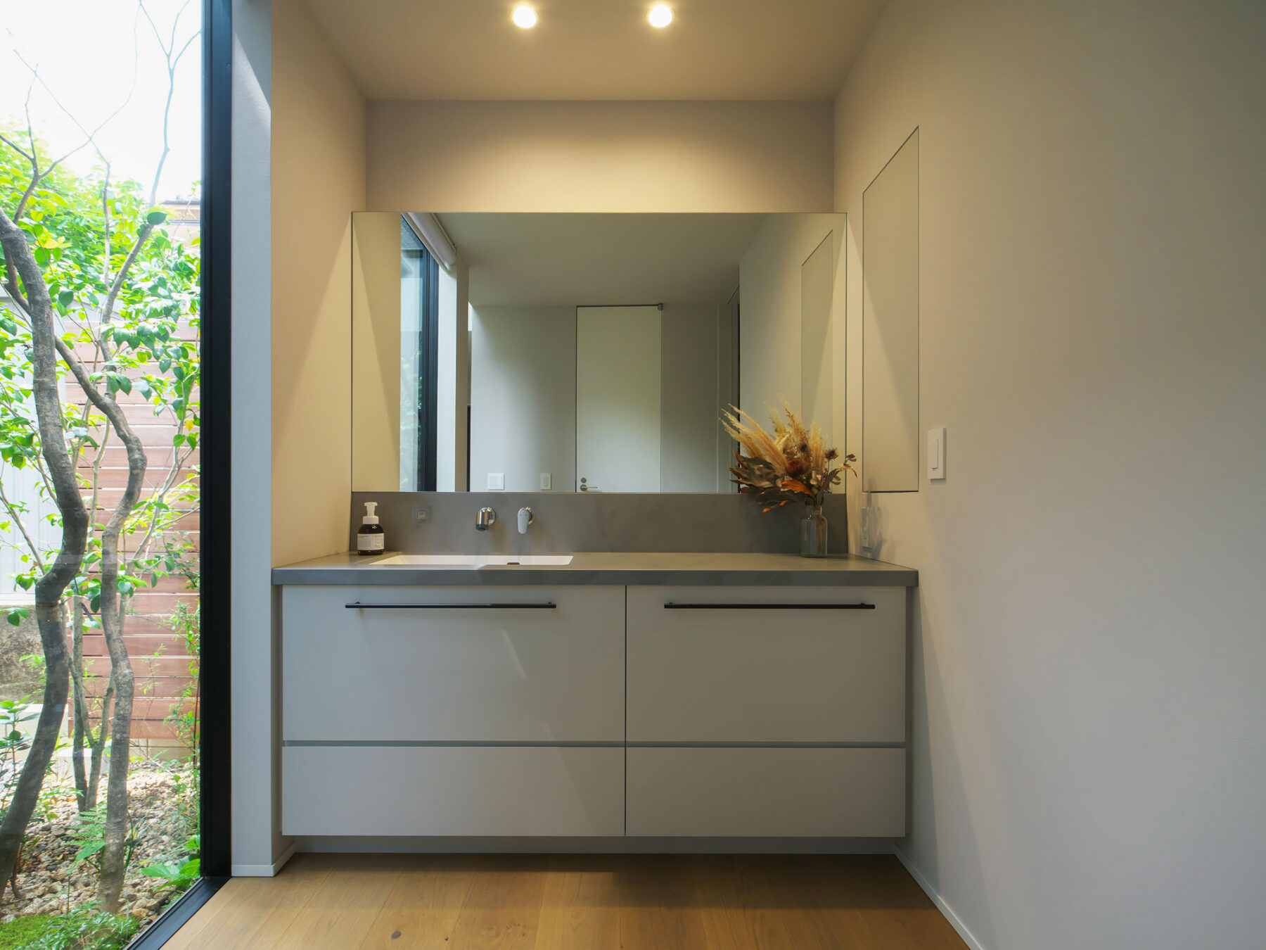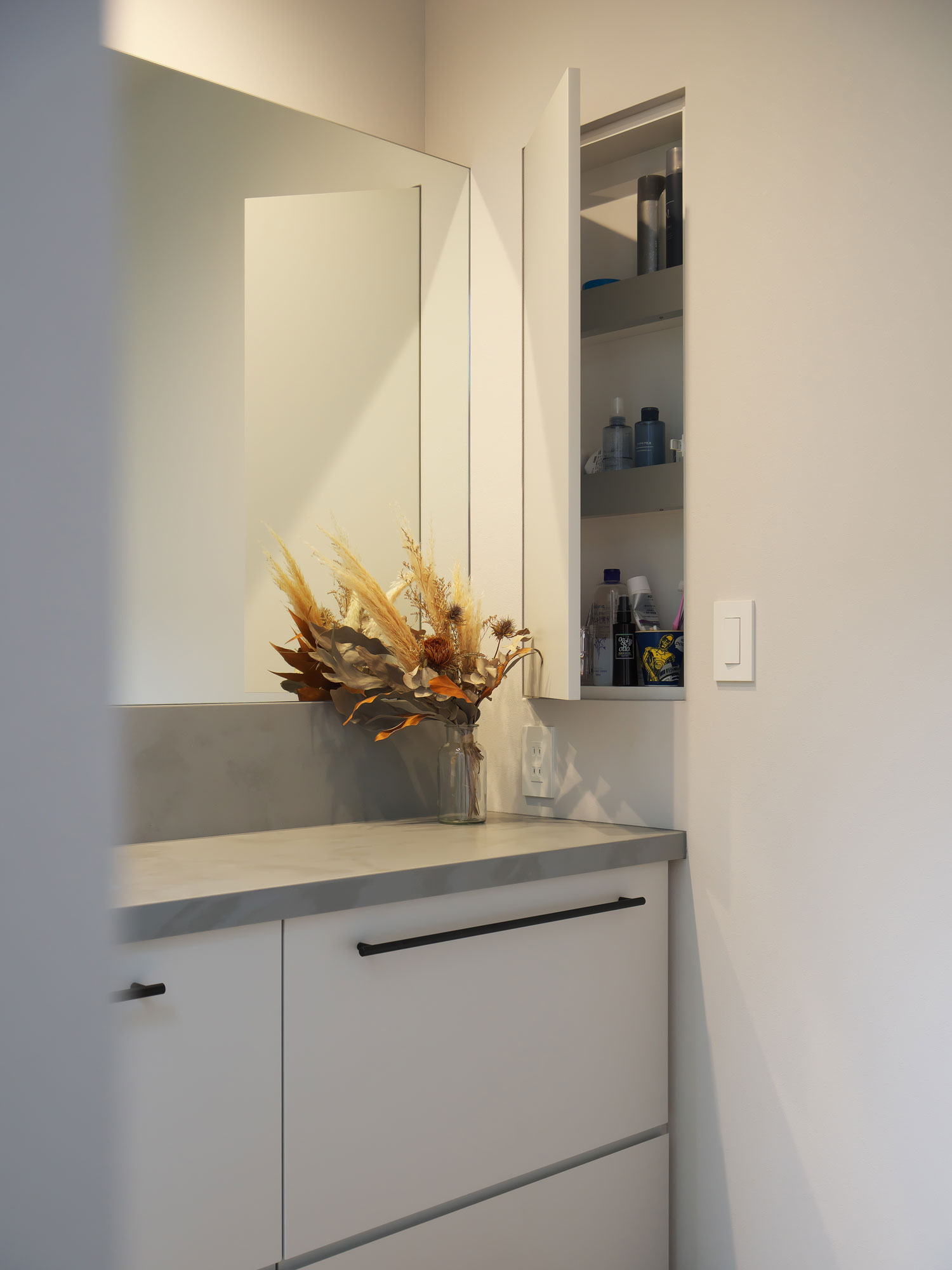 • コンクリート調のワークトップがオシャレな造作洗面台。