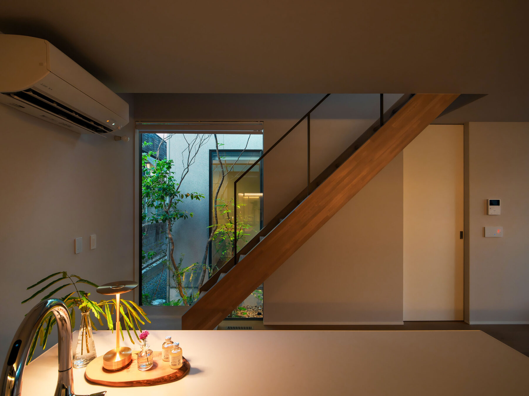 複数の庭、吹き抜け、視線の抜け、段差、素材の切り替え——。さまざまな要素が相互につながり合い、“中間領域”が心地よさをつくる住まい「間の家」。