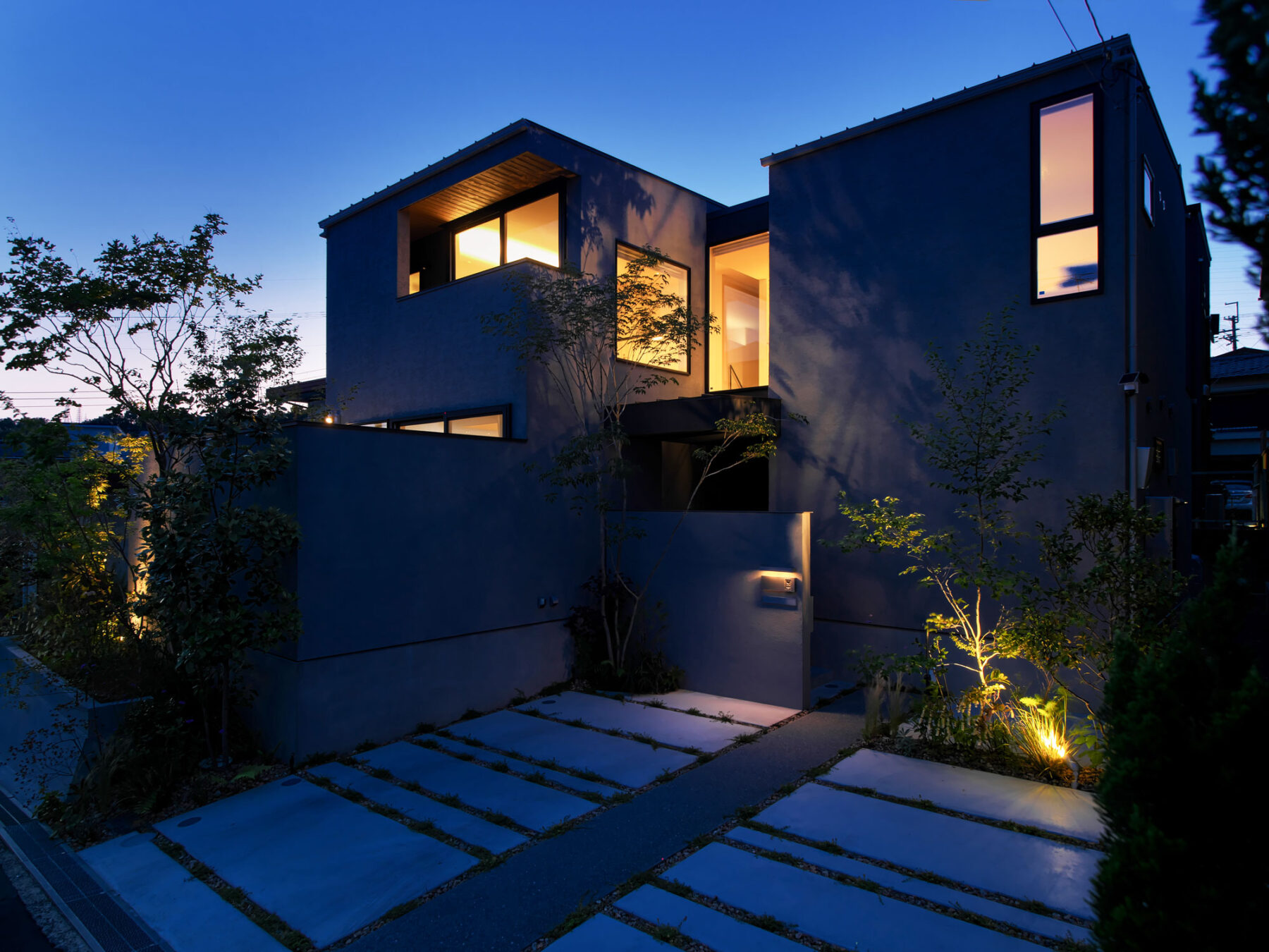 • 高さ・奥行きの異なる箱を組み合わせた構成の外観。