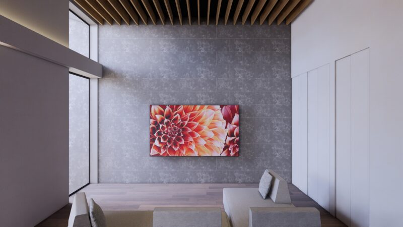 大開口の先にはテラスの植栽がライトアップされ、室内にいながら自然の潤いを感じられる贅沢な設え。まるで屋外ラウンジとひと続きのような空間の広がりを感じられます。