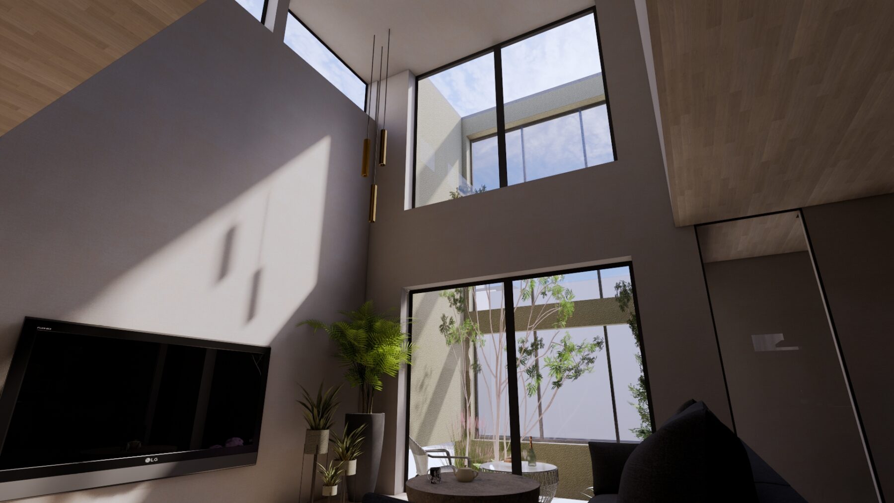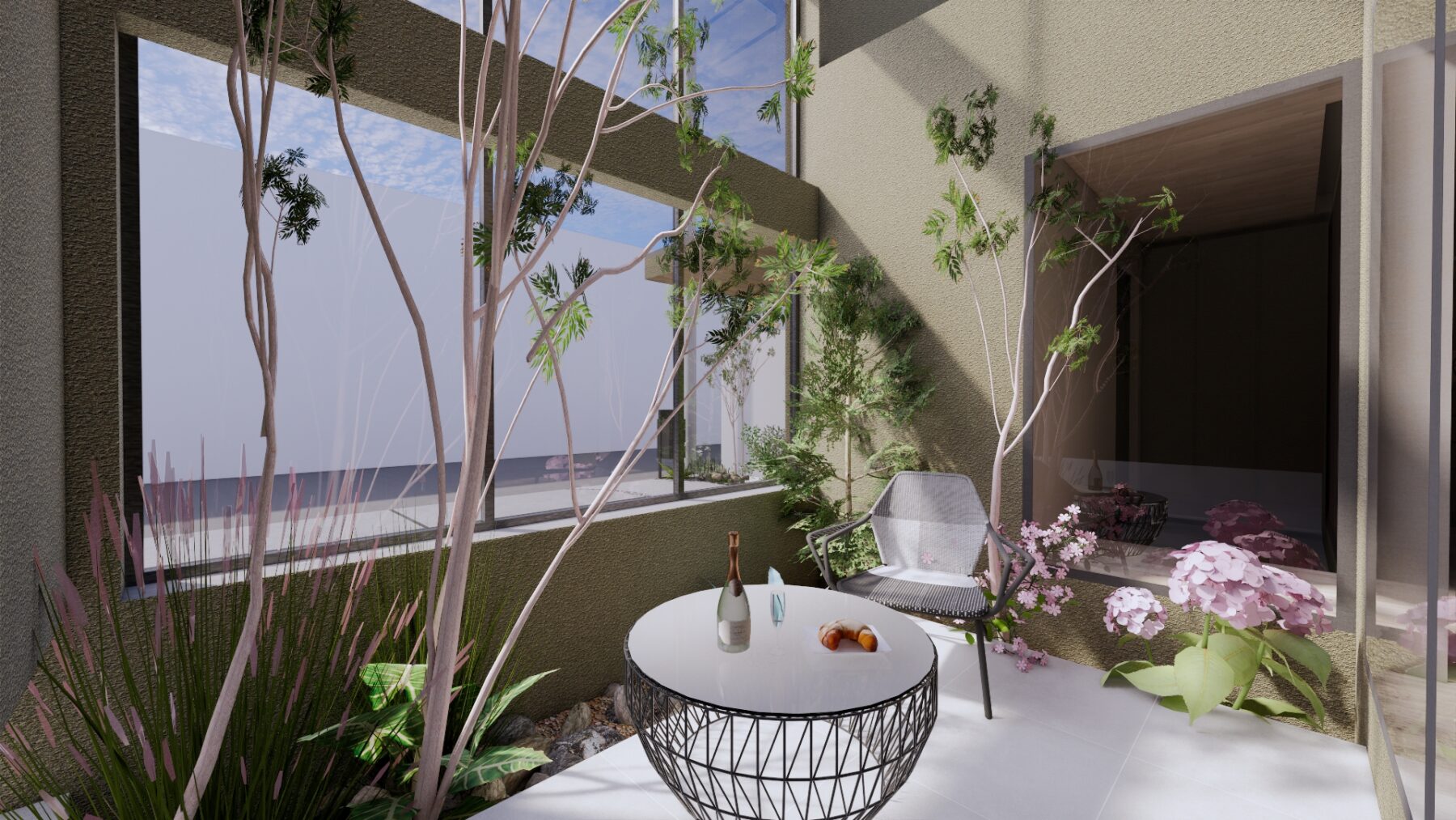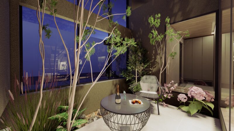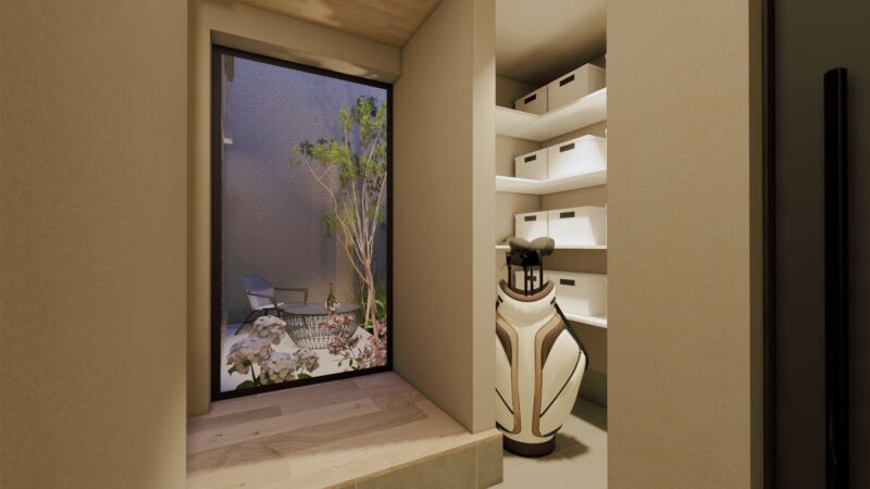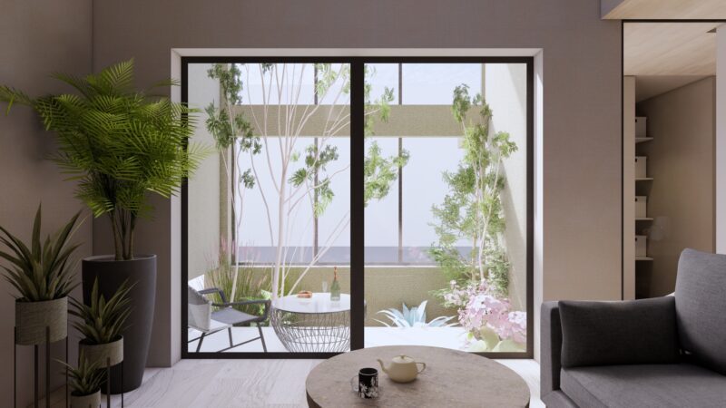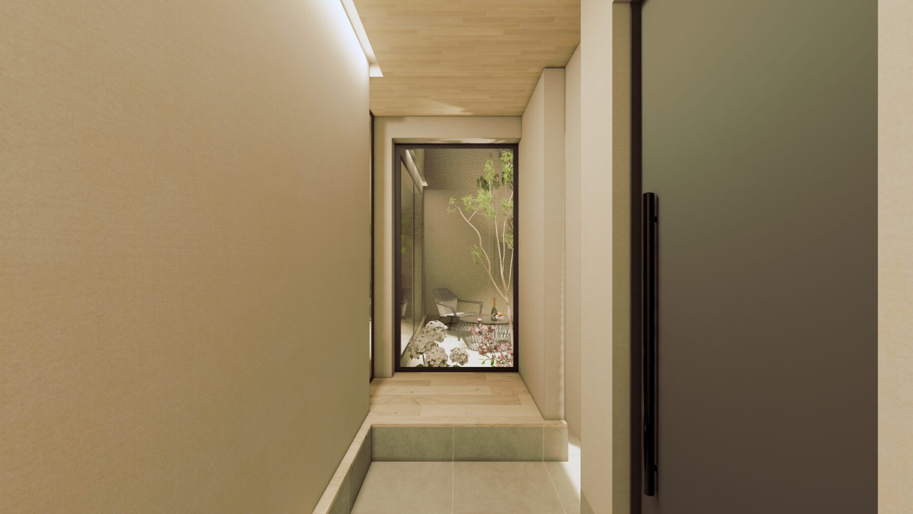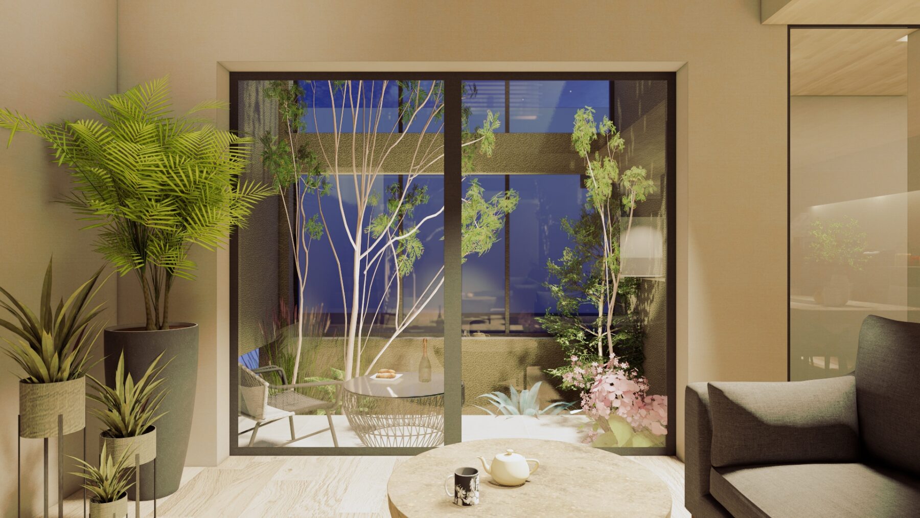 大きな開口越しに植栽が映り込み、外から見ても街並みと自然に調和するよう計画されています。