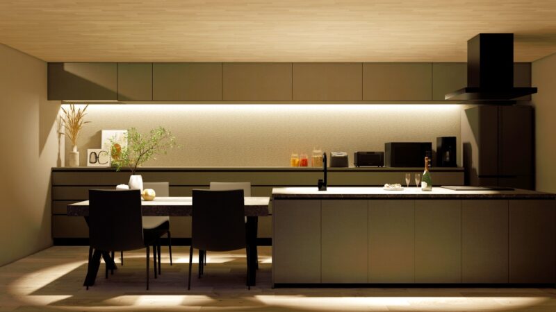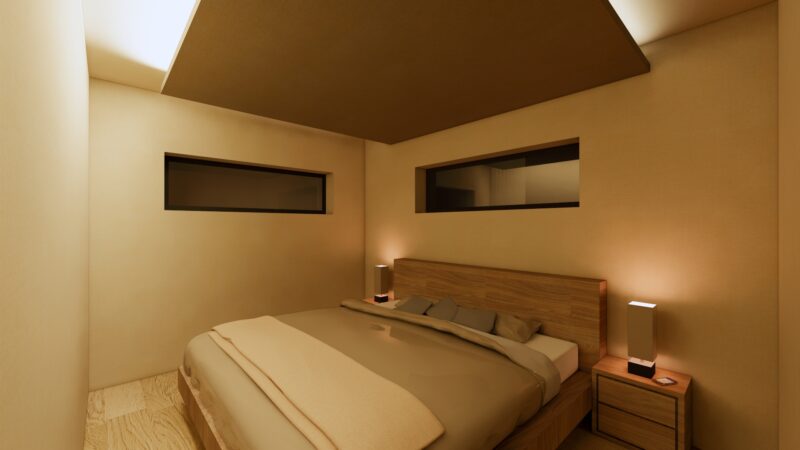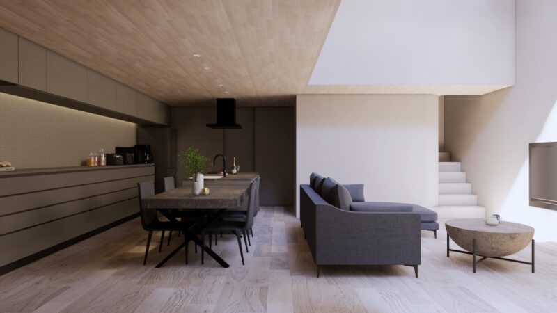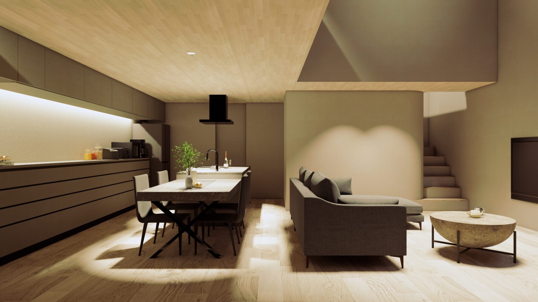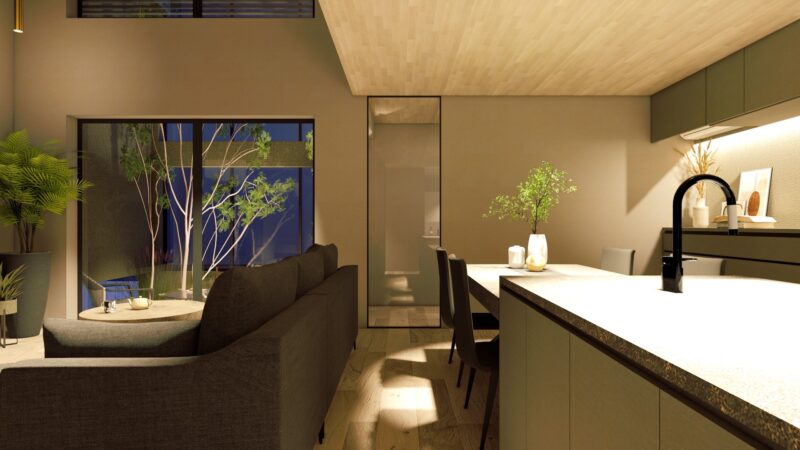 室内は木のぬくもりを活かしたデザイン。昼は窓からの自然光で明るく、夜には照明計画によって温かい灯りと素材が調和し、家族団らんの時間をやさしく包み込みます。